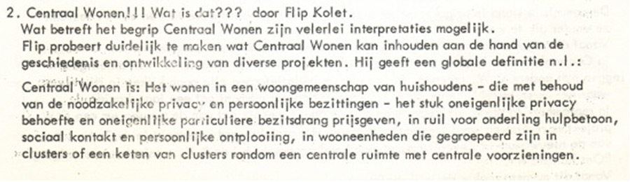Wat verstonden zij onder Centraal Wonen? In de eerste nieuwsbrief van april 1979 wordt dit als volgt geformuleerd: